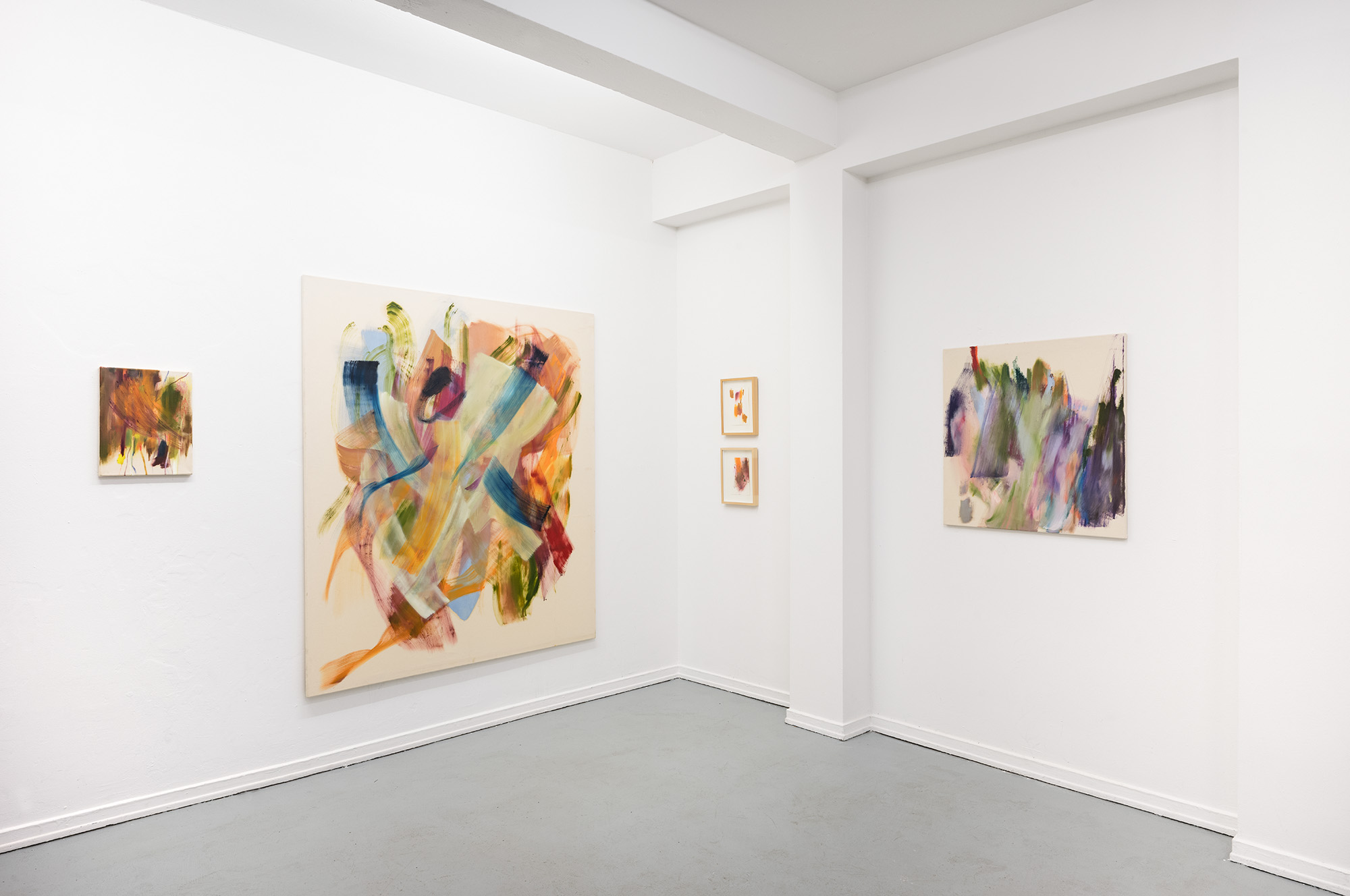 Immer wieder bricht die Malerin mit vorgegebenen und selbstgesetzten Regeln und nutzt, obwohl Ölfarbe einen langsamen Trocknungsprozess besitzt, schnelle und ausdrucksstarke Schwünge mit schwer getränktem Farbpinsel aus dem ganzen Körper, oder kleine filigrane Striche aus dem Handgelenk, welche über den Bildträger gleiten und stellt damit ganz essenzielle Fragen der Kunst und Malerei. Zeit ist dabei ein Faktor über den nachzudenken gilt – sei es das Erarbeiten schneller, dennoch bewusster Setzungen oder auch großer Gesten die schnell wirken, aber in einer gewissen Langsamkeit manifest werden. Es ist ein Spiel mit dem Auge, welches Deutungen offen lässt und dabei auf den Status der Leinwand oder das Papier eingeht. Oft wird die Leinwand in einem rohen Zustand sichtbar, und ohne Grundierung bringt die besondere Physis des Malens die Materialität der Leinwand zum Sprechen. Raum gibt Hilbolt ihren Arbeiten in voller Größe. Neben großformatigen Malereien präsentiert sie auch ihre kleineren Papierarbeiten.