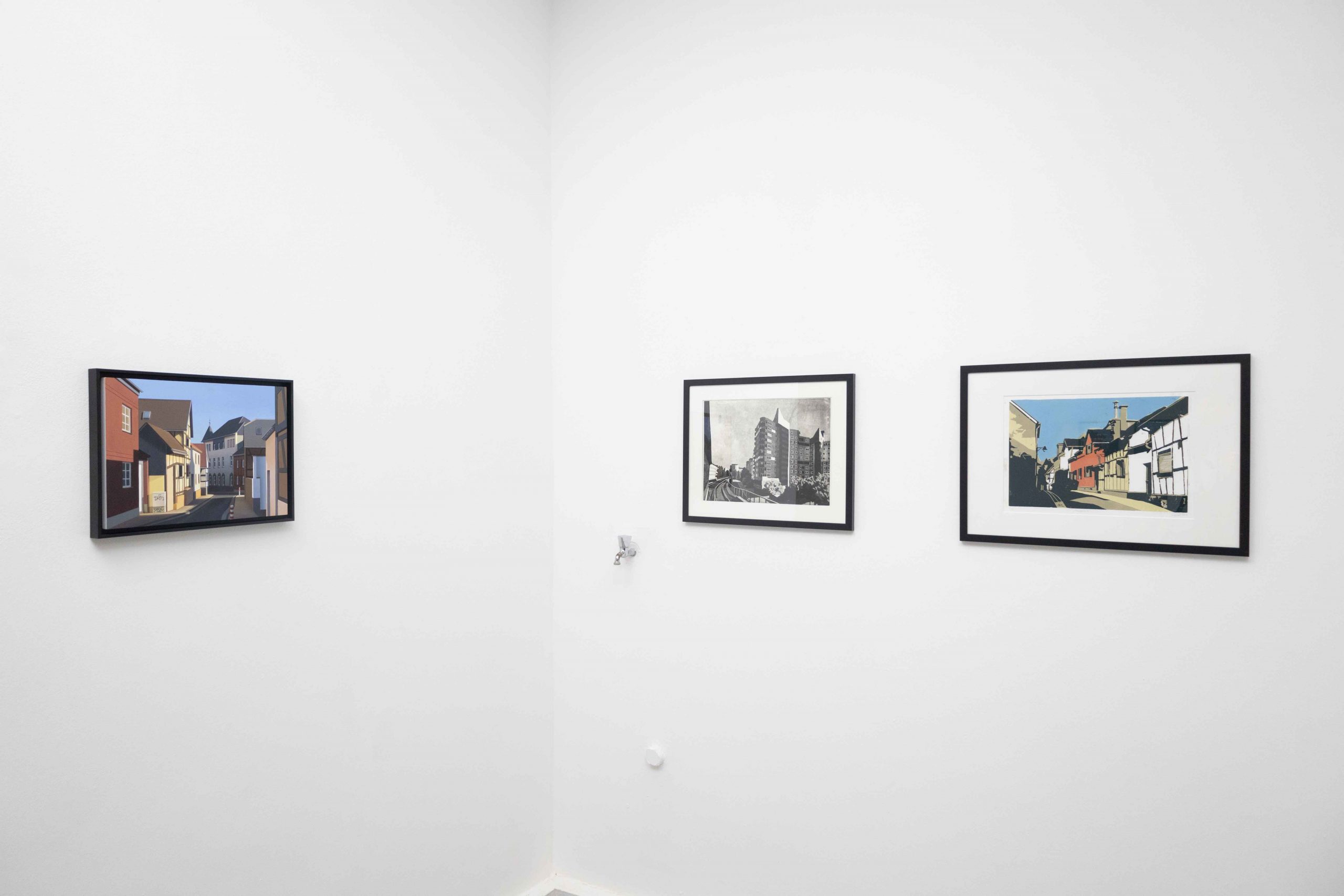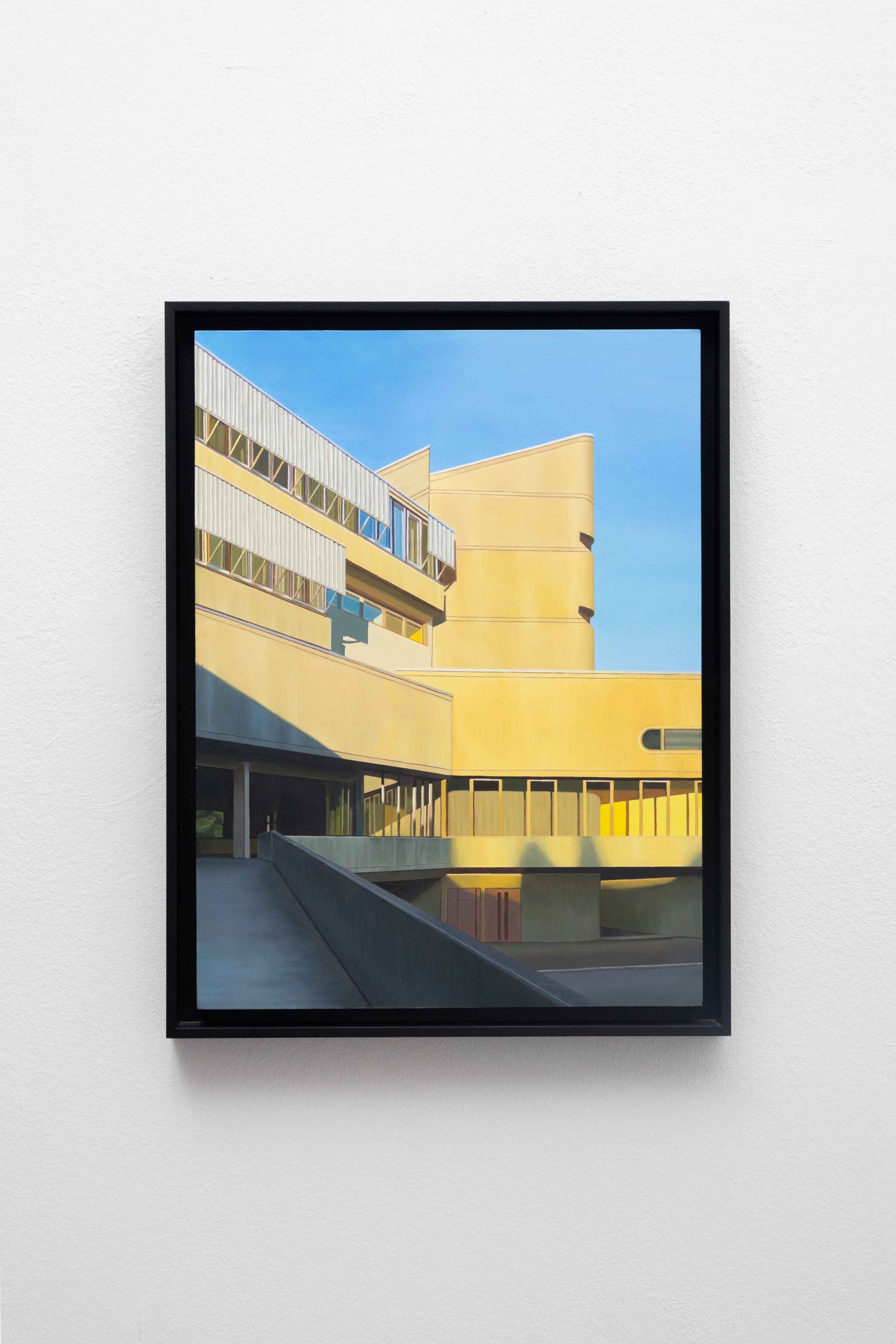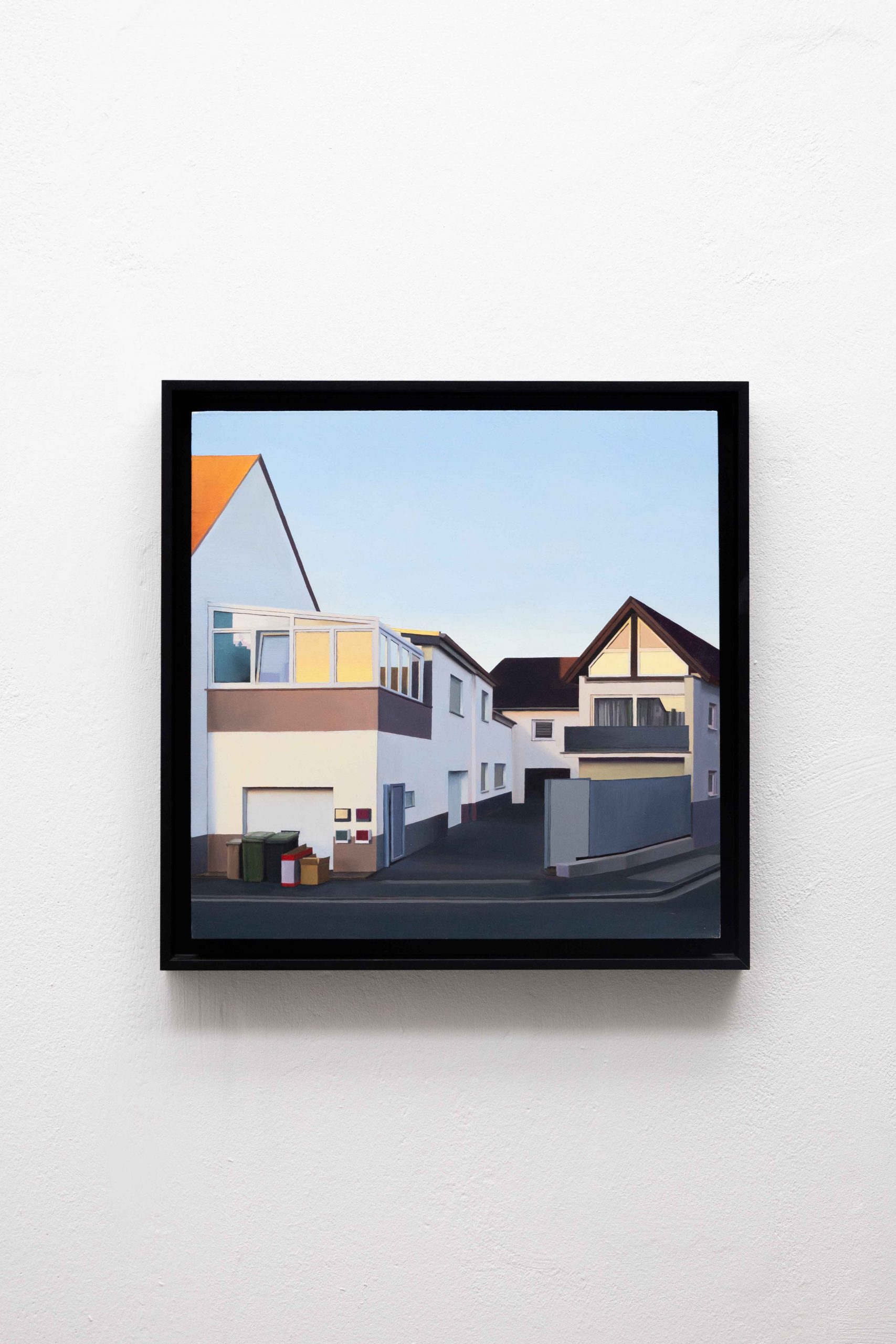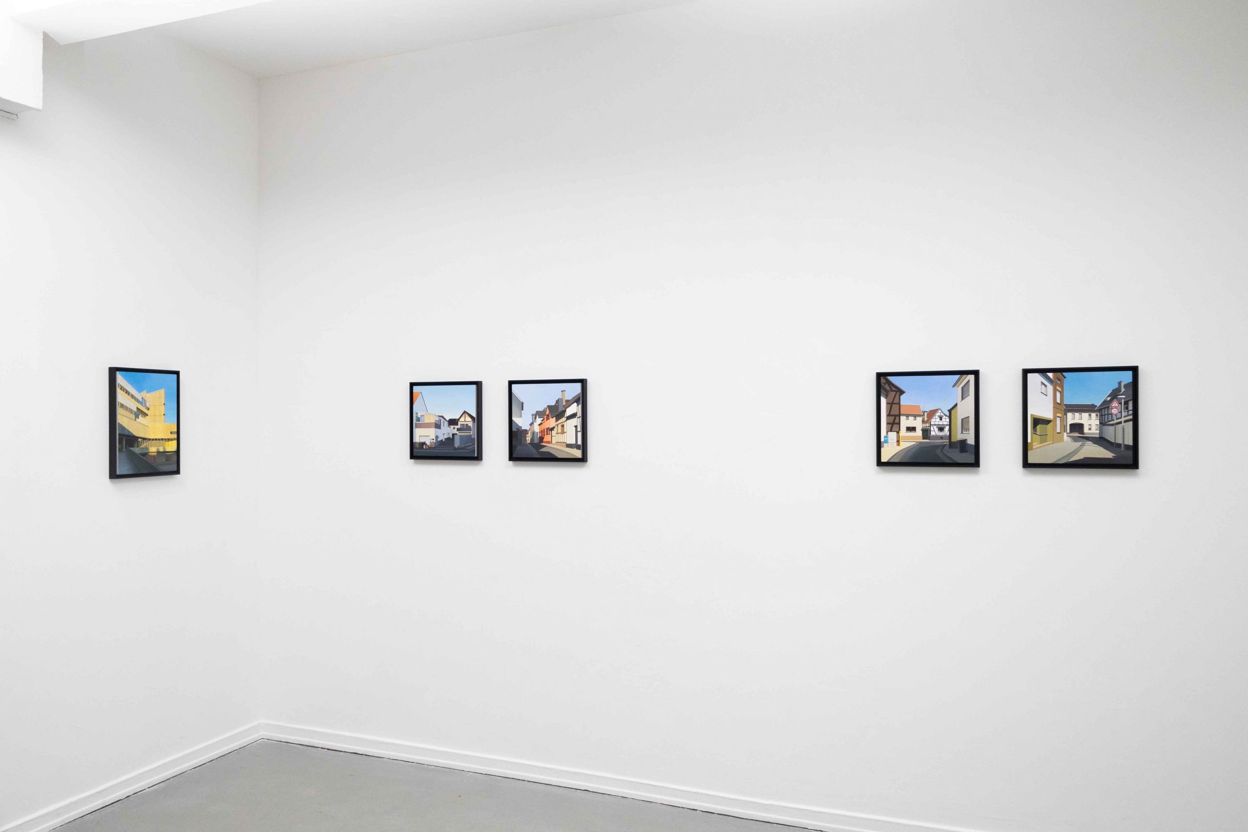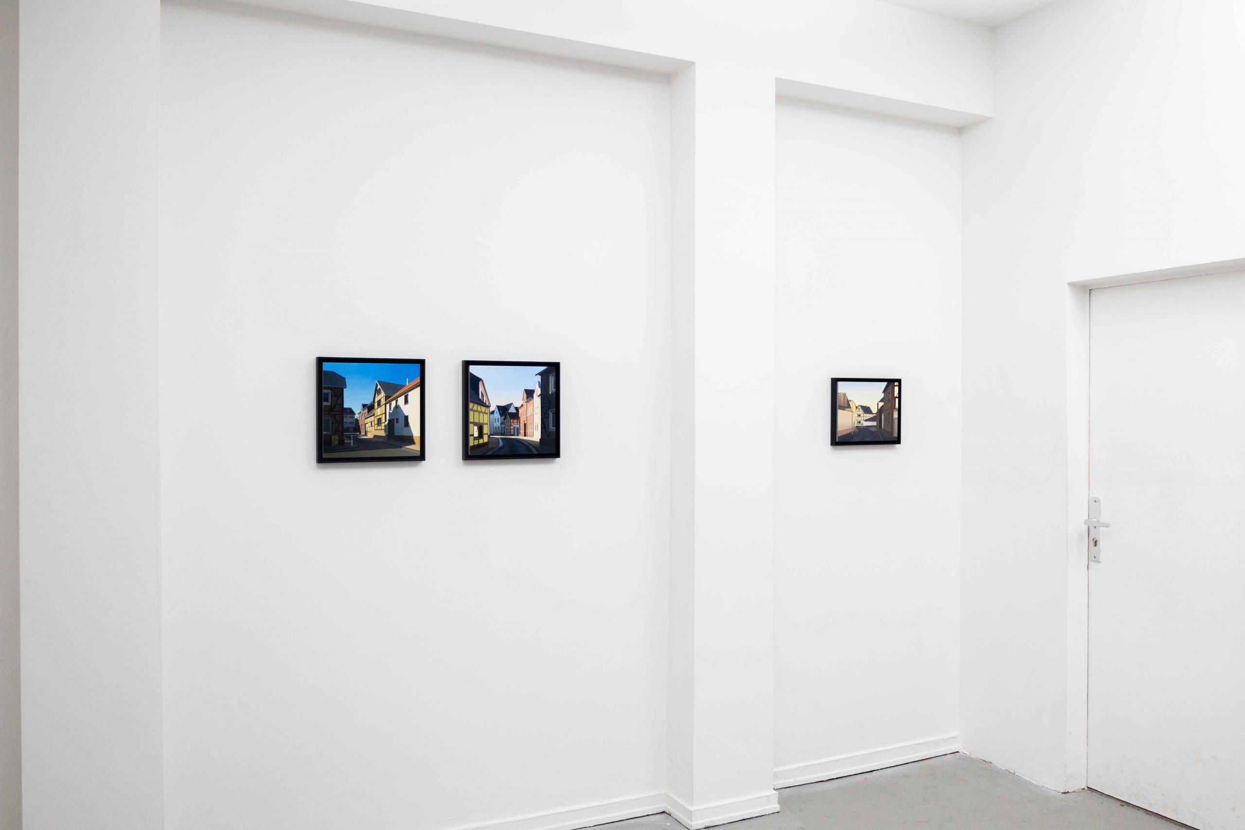 In ihrer Ausstellung zeigt Helena Jandt Malereien, die ihreunmittelbare Umgebung einfangen. Sie schafft reine Fassaden ununterbrochene Flächen; eine dünne Linie zwischen Trostlosigkeit und strahlenden Farben im Sonnenlicht.